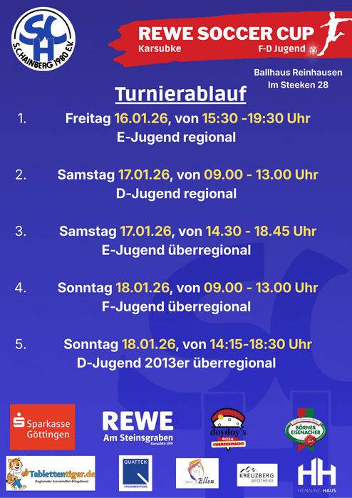 Wir freuen uns auf spannende Turniere und viele Tore beim REWE Soccer Cup 2026 im Ballhaus Reinhausen.