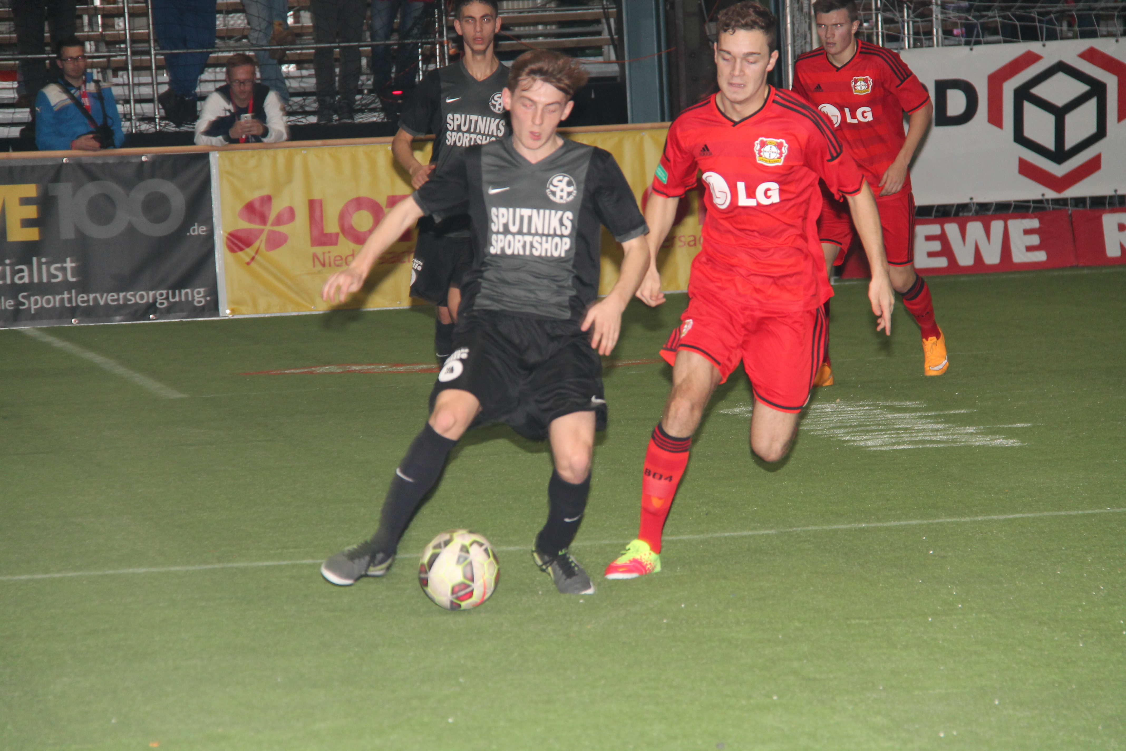 (rm) Mit seinem Last-Second-Tor gegen den JFV Rhume/ Oder (Bilshausen/ Lindau) hat Laith Mugames (links im Bild) die Träume der Hainberger A-Junioren auf das Erreichen der Zwischenrunde beim Sparkassen-VGH-Cup in der Lokhalle aufrecht erhalten. Alles schien gegen die Jungs vom Hainberg zu laufen. Rhume/ Oder hatte die Führung durch Laith Mugames (4. Min) zur Hälfte der Spielzeit ausgeglichen und war 1:12 Minuten vor dem Ende nach einer Zwei-Minuten-Strafe gegen Hainbergs Bösebeck in Überzahl gekommen. Als sie dann 20 Sekunden vor dem Ende auch noch einen Freistoß zugesprochen bekamen, schien sogar der Punkt der Hainberger hochgradig gefährdet. Doch irgendwie gelang ihnen ein Befreiungsschlag, dem Laith Mugames nachsetzte und eigentlich hatte Rhumes Keeper den Ball schon sicher, um ihn dann unter dem Bauch durchrutschen zu lassen, so dass Laith aus einem Meter sieben Sekunden vor dem Ende zum vielumjubelten Siegtreffer einschieben konnte. Damit haben die Jungs von Oliver Hille und Christian Dreher das Motivationstor für den zweiten Tag ganz weit aufgestoßen.