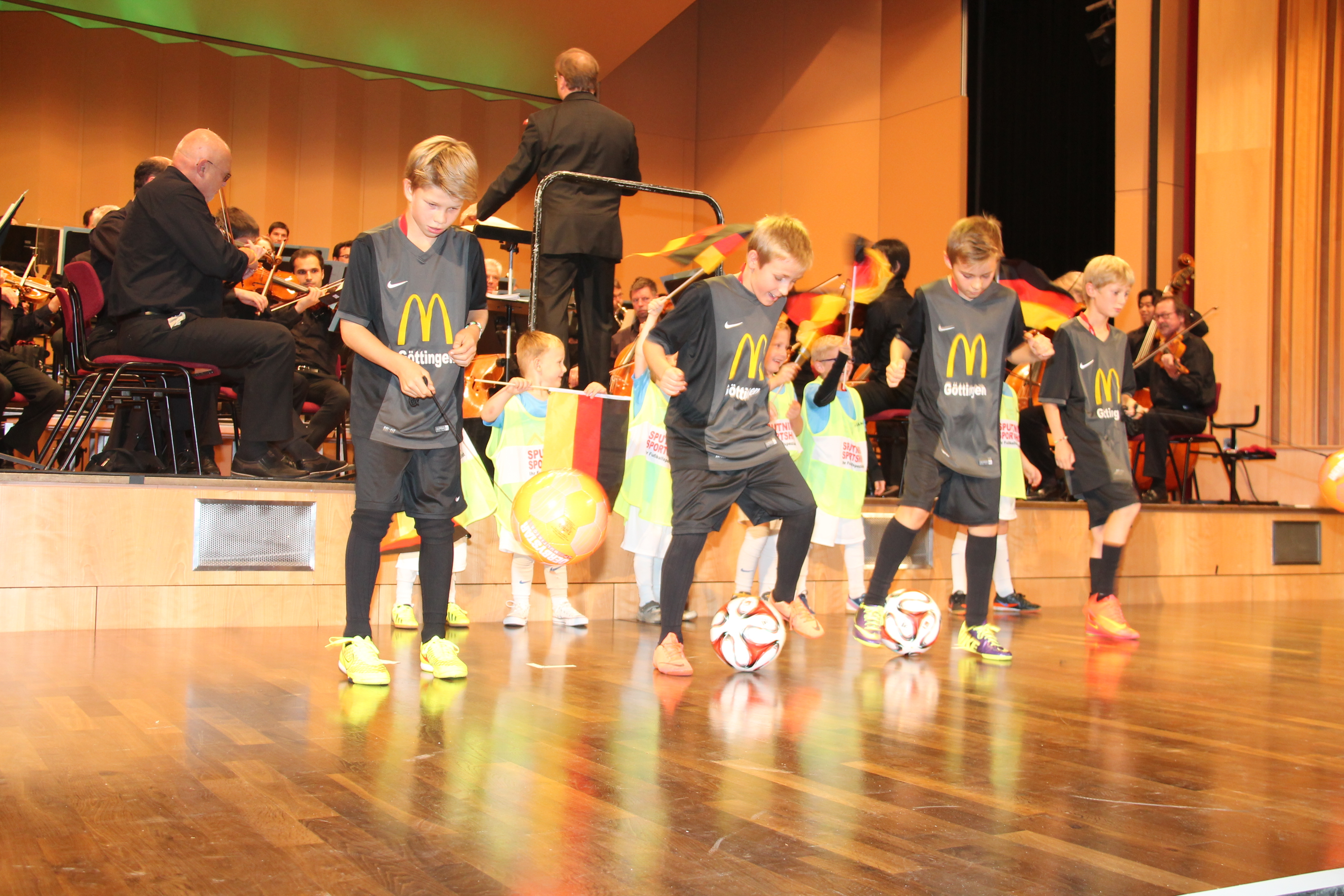 (rm) Es wurde geübt, es wurde gezittert und am Ende vergaßen alle Hainberger Kids die 900 Zuschauer in der Göttinger Stadthalle beim Betreten der Bühne ihre ganze Aufregung. Als zweiter Act nach der Pause zeigten die D-Kicker von Lars Willmann und Niklas Pfitzner zur "Hochzeit des Figaro" vom Göttinger Symphonie-Orchester das kleine ABC am Fußball und ließen sich am Ende mit den jugendlichen Basketballerinnen der BG 74 sogar eine Koordinationsübung mit Ball und Hand ein. Gut zur Geltung kamen dabei auch die neuen Trikots des Kreisliga-Spitzenteams mit dem McDonald-Schriftzug von Werbepartnerin Petra Hebig.