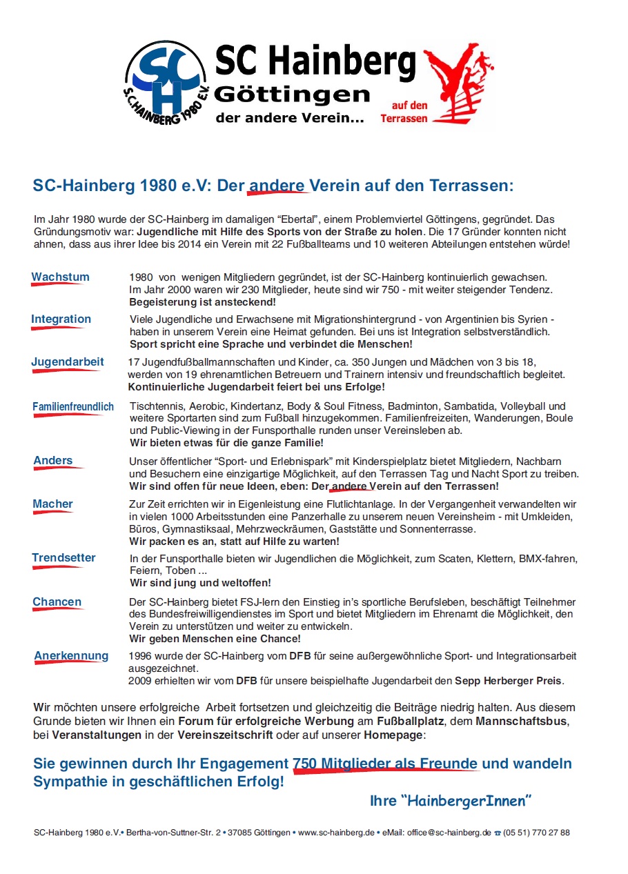 Wir freuen uns, dass Du dich für den SC Hainberg interessierst. ”Sport spricht alle Sprachen und führt die Menschen zusammen”, das ist die Philosophie des Vereins auf den Göttinger Terrassen. Auf unserer Homepage findest Du alles Wissenswerte über unsere Angebote, unsere Location und die Menschen, die den SC Hainberg lebendig machen.
