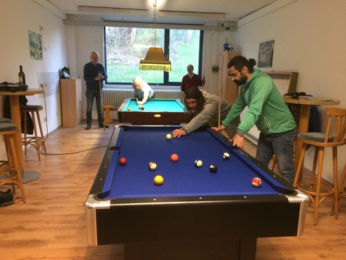 Am Mittwochabend wird es zeitweise eng im Billardraum. Beim Hainberg bieten wir zwei Varianten des Billardspiels an: Karambolage (hinten) und Poolbillard (vorne).