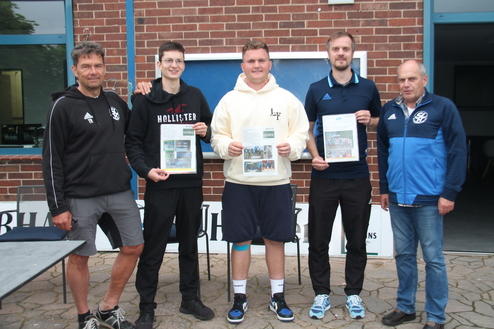 Steffen Schulze, Thorben Linne und MIran Hamza (.l.) wurden für ihren Einsatz von ihren Spieler*innen und den Eltern gelobt und beschenkt