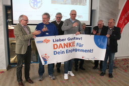 „Da wir ja nun auch einen Fahrstuhl zu meinem Büro haben, können es noch ein paar Jahre werden!“ blickte Gustav in die Zukunft und freute sich über die Geschenke und das Glückwunsch-Banner, das einen Platz zu Hause finden wird.