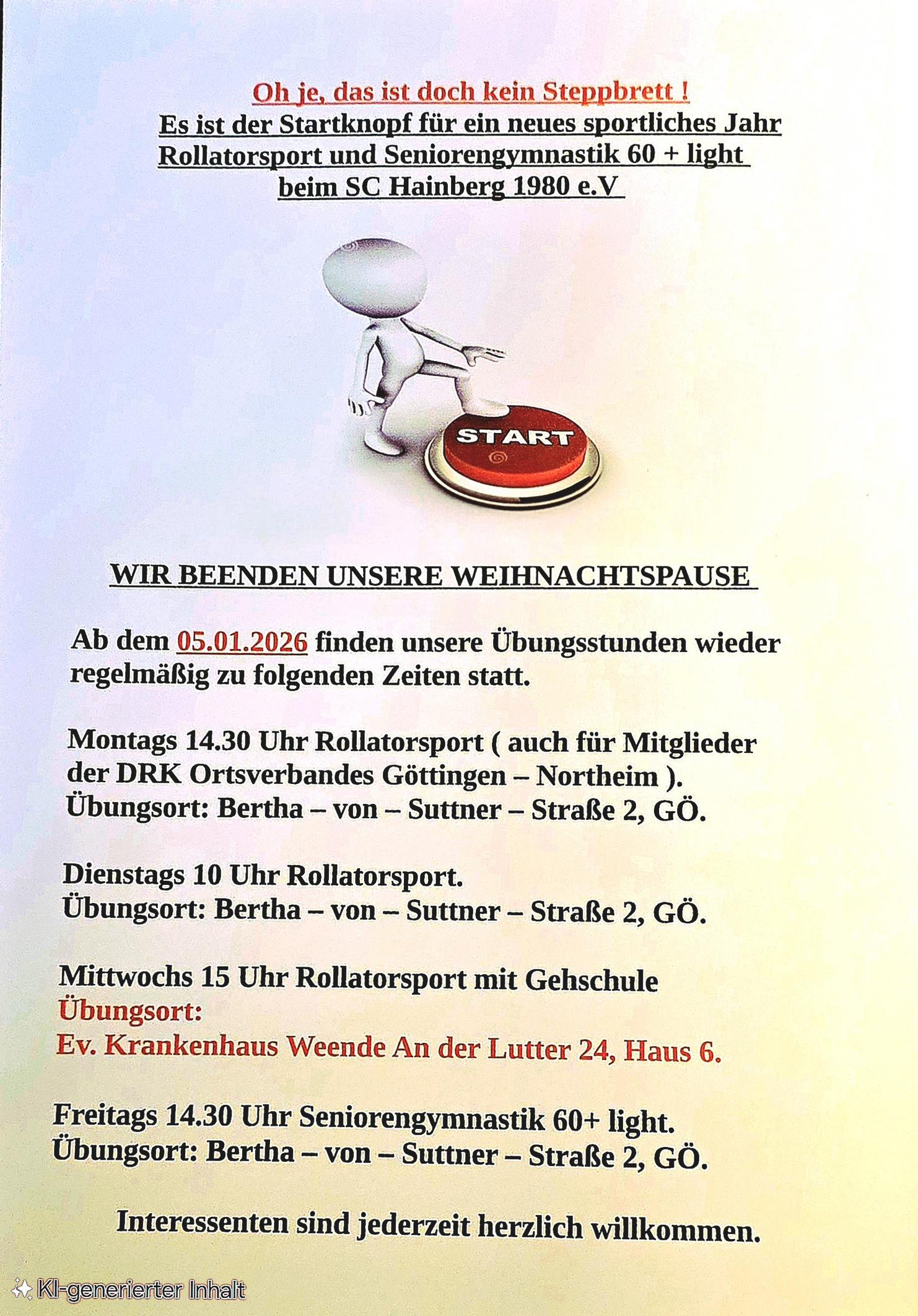 Der Rollatorsport findet montags um 14.30 Uhr und dienstags um 1O Uhr im Vereinshaus Bertha-von-Suttner-Str.2 statt. Dort findet auch jeden Freitag um 14.30 Uhr die Seniorengymnastik 60+ light statt. Ab 29.10.25 wird dann zusätzlich jeden Mittwoch um 15 Uhr der Rollatorsport auch in den Räumen des EK Weende angeboten.