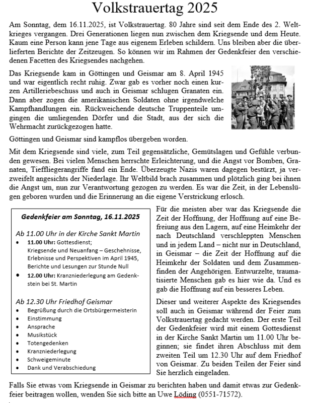 Am Sonntag, dem 16.11.2025, ist Volkstrauertag. 80 Jahre sind seit dem Ende des 2. Weltkrieges vergangen. Drei Generationen liegen nun zwischen dem Kriegsende und dem Heute. Kaum eine Person kann jene Tage aus eigenem Erleben schildern. Uns bleiben aber die überlieferten Berichte der Zeitzeugen. So können wir im Rahmen der Gedenkfeier den verschiedenen Facetten des Kriegsendes nachgehen.